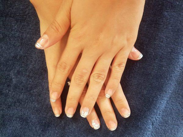 Luego de comprobar que este seco e siguiente paso será adherir las cintillas conforme al diseño deseado. Porque si adherimos las cintillas antes de secarse el esmalte puede que al retirarla lo levante y no es lo que queremos lograr.