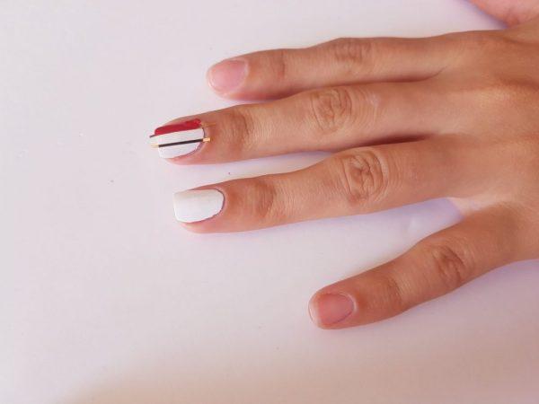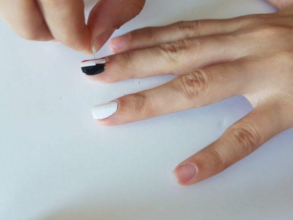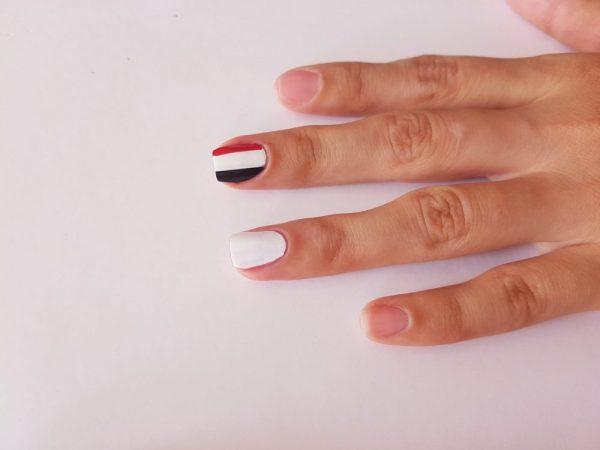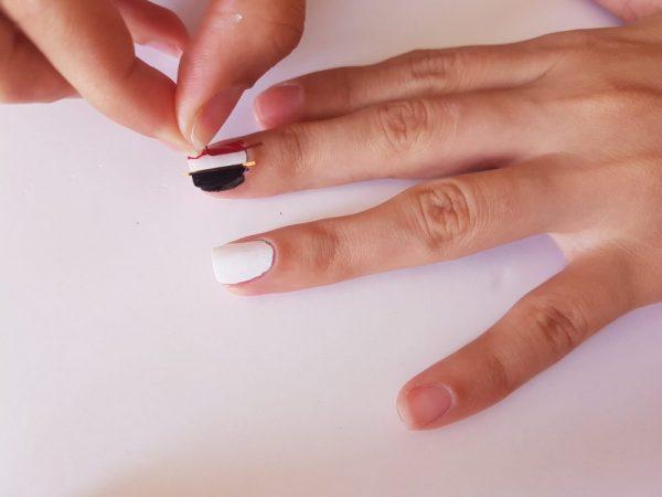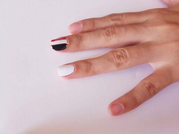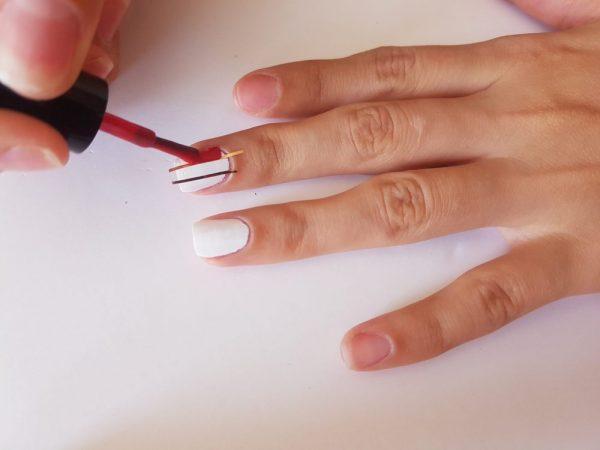 Luego de tener cada cinta adherida, pasamos a esmaltar con otro u otros esmaltes de diferente color.