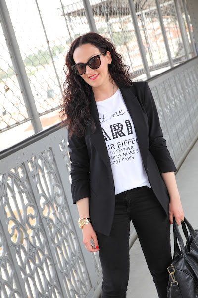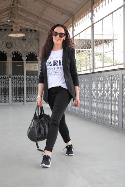 Las fotos están hechas en el Elevador de Santa Justa, un lugar muy bonito en el que puedes disfrutar de unas increíbles vistas de la ciudad de Lisboa. En él llevo un outfit cómodo para hacer turismo pero que perfectamente podemos llevar en nuestro día a día. Vuelvo a utilizar mi querido negro, que esta vez combiné con blanco en un look con blazer, camiseta y jeans. En los pies mis queridas Nike Kaishi Run, las zapatillas para andar más cómodas que he tenido en toda mi vida. Creo que alguna vez ya os lo he dicho, pero después de utilizar Adidas, Munich, New Balance, Converse..., en comodidad estas Nike ganan y con diferencia.