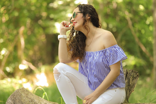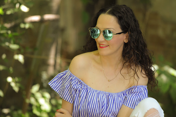 Las camisas de rayas se reinventan y se adaptan a todas las tendencias y la prueba es la que os enseño en el look de hoy, una camisa de rayas con volantes y escote off shoulders, una prenda que promete ser la estrella de esta primavera. Con jeans queda perfecta pero me apeteció darle un aire más formal y la combiné con un pantalón blanco de estilo masculino. De bolso una bombonera bandolera azul m ...