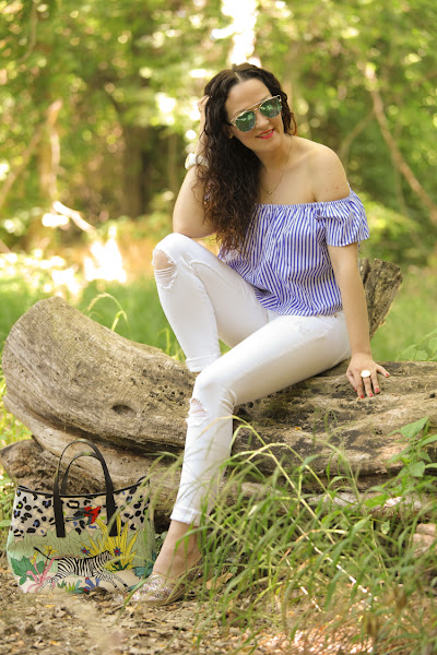 En cuanto al look, el viernes me llegó a casa este precioso top de rayas con escote Bardot que me moría de ganas por estrenarlo. Como quería ir muy cómoda me fue genial, así que me lo puse con unos jeans blancos, mis esparteñas de purpurina y uno de mis bolsos preferidos para el verano.