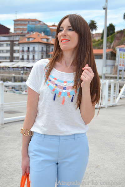 Es época de camisetas, una camiseta bonita y un pantalón o una falda y ya tienes el look del día resuelto. El look de hoy es tal que así, un look muy sencillo donde la pieza fundamental es una camiseta de estampado étnico de la tienda C&C de Avilés, hace muy poco os hablaba de ella, podéis ver el post pinchando aquí,esta camiseta me encantó, no sólo por los colores y el estampado, sino por los detalles de los pompones y de las aplicaciones metálicas que trae. Para combinarla respeté los tonos de la propia camiseta así que opté por el pantalón azul cielo que os enseñaba hace poco en otro look, los zapatos naranjas y un bolso de Gianni Chiarini también en color naranja. Qué os parece el resultado? Tendéis a tirar de camisetas originales para vuestros looks?