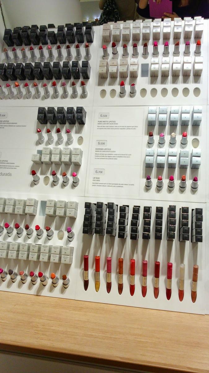 Y aquí, algunos de los labiales y glosses que podemos encontrar. Si miráis a la izquierda, cuarta fila hacia abajo, extremo izquierdo, veréis un labial rojo precioso que se vino conmigo. Je je!