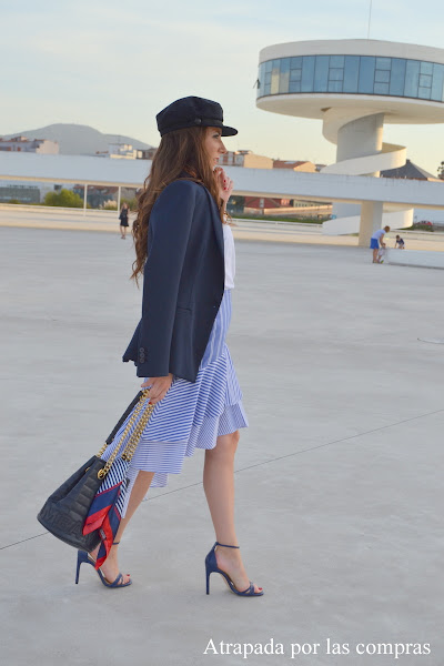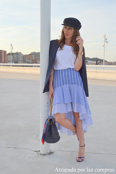 Una de las tendencias del verano ha sido el estampado de rayas, prendas a rayas inundaron nuestros armarios y una de esas prendas es la que os enseño hoy, una falda de rayas asimétrica y con volantes. En Asturias nos ha llegado el verano justo esta semana así que es el momento perfecto para crear un look de entretiempo aprovechando ciertas prendas de verano combinadas con las de la nueva temporada y a la vez mezclar tendencias. Así que combiné la falda de rayas asimétrica con una camiseta blanca de manga corta y detalles de perlas, este otoño/invierno las perlas van a ser las protagonistas de nuestros looks, camisetas básicas como las que os enseño hoy, jeans, jerseys, blusas, vestidos incluidos todo tipo de complementos, si os gustan las perlas no vais a tener excusas. De prenda de abrigo una blazer azul marino y de calzado sandalias de tiras azul marino (me resisto a quitarme las sandalias, al menos de momento). Y este look de entretiempo lo remato con lo que va a ser uno de los complementos imprescindibles para el otoño 2017 si te gusta llevar algo en la cabeza, la gorra marinera. Qué os parece el look?