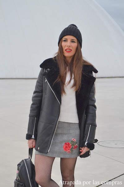Como ya os había comentado en otro post anterior, el Príncipe de Gales es el estampado estrella de este otoño/invierno 2017/2018 y la prueba es que podemos encontrarlo en un sinfín de prendas. Pero este estampado de cuadros british que, además admite diferentes estilos, desde el más formal, de fiesta hasta el más casual, no se nos presenta sólo sino que podemos encontrarlo reinterpretado junto con bordados que le dan un toque diferente . Y eso es lo que os enseño hoy, un look casual donde la protagonista es una minifalda con estampado Príncipe de Gales con bordados de flores que combino con un jersey básico blanco, una prenda tan llamativa necesita poco más y creo que combinarla con básicos es todo un acierto, aunque también se puede arriesgar. De calzado opté por mis nuevas botas moteras con perlas, me parecen lo más, tengo que reconocer que no soy mucho de este tipo de calzado pero estas botas han sido todo un flechazo. De prenda de abrigo una cazadora biker de doble faz negra, una de las prendas de abrigo tendencia esta temporada y además super calentita. Y como bolso....una mochila con bordados de flores. Si, una mochila! hacía años que no utilizaba una mochila y ya se me había olvidado lo cómodas que son. Qué os parece el look?