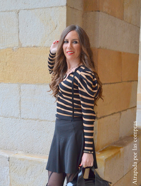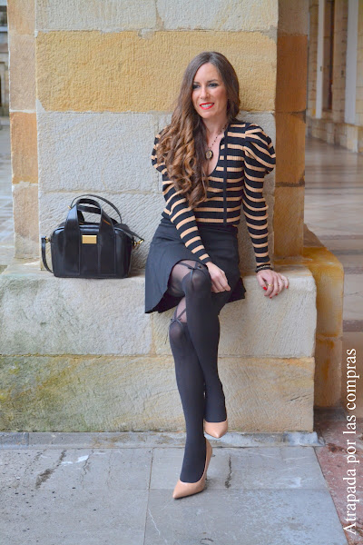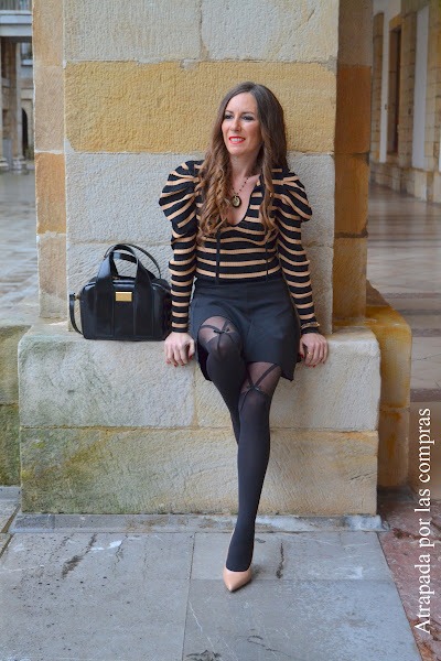 Una de las tendencias de esta temporada son las mangas abullonadas que podemos encontrar en jerséis, camisetas, vestidos, chaquetas.... Hoy os enseño un look donde la prenda protagonista es un Jersey de rayas con las mangas abullonadas que combino con una falda negra skater. El toque especial del look son sin ninguna duda las medias
