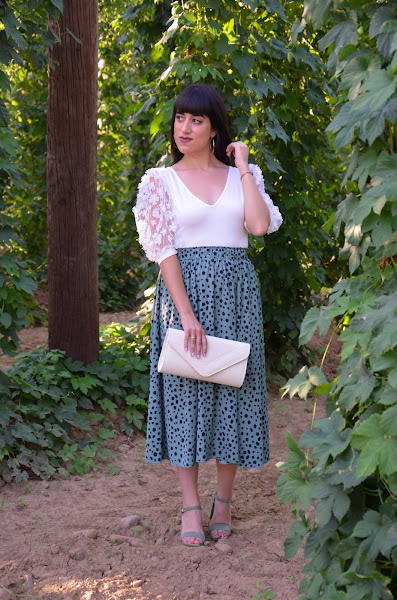 ¡¡¡ Buenas tardes Bauler@s !!!Por aquí llega el siguiente look, este un poco más arreglado con este conjunto de body y falda, ambas prendas de Shein.El body es una pasada, me encantan las mangas abullonadas con aplicaciones de flores y purpurina. Tiene una tela muy elástica y ligera lo que lo hace ideal para el verano.Por otro lado, la falda midi en color verde y con estampado de lunares desiguale ...