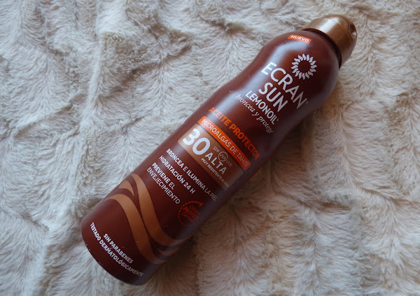 CUERPO: Aceite solar en spray Ecran Sun Lemonoil SPF 30. Si hay algo que me molesta mucho a la hora de tomar el sol, son las cremas que dejan toda la cara y el cuerpo blanco porque no se disuelven bien. Con los aceites eso no pasa, a demás dejan la piel brillante e hidratada. Lo que más me ha gustado de éste aceite es que no me he quemado ni un solo día de los que me lo he puesto. He probado muchas cremas, también con factor de protección solar alto y siempre me he "chamuscado". La sensación es súper ligera y duradera.