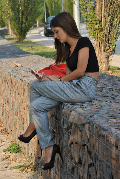I combined some high waisted grey chinos with a black crop top. I made a little bow with the belt. I have to say that this is not my kind of pant, since I am wearing skinny jeans I almost just wore skinny jeans... But how to resist to buy them? They were only 599€... Love at first sight!