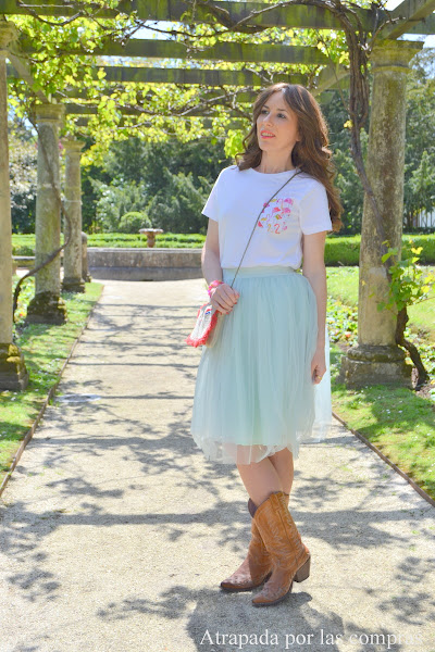 Los flamencos están por todas partes y se han convertido en el print más de tendencia de esta temporada, podemos encontrarlos en vestidos, bolsos, bikinis, pendientes.... En el look de hoy combino una camiseta de la firma asturiana MI CAPITÁN, que abrió recientemente tienda en Avilés, una camiseta que puede ser una básica pero que el detalle del bolsillo con estampado de flamencos la convierte en una prenda especial y diferente. La combiné con una falda de tul aguamarina, más flamencos en un bolso bandolera y una pulsera de piedras naturales hecha a mano de LA NENA, una firma de joyería asturiana de la que ya os enseñe un precioso collar en verano, y que también encontré en MI CAPITÁN. El punto mas arriesgado de este look lo di con el calzado, he vuelto a rescatar del olvido mis queridas botas SENDRA, y sin duda me encantan como quedan con faldas de tul.