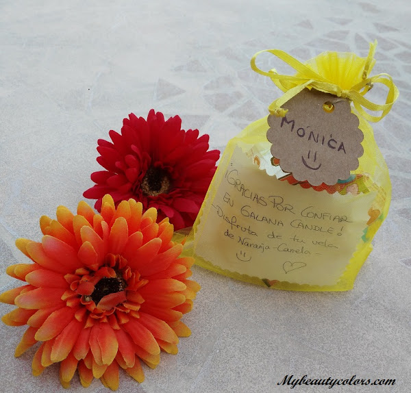 En la siguiente foto podéis ver el pack completo (bolsa amarilla con nota y piruleta, vela de naranja y canela y pendientes regalo).