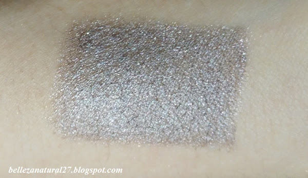 Me gusta porque no hay que hacerle punta ya que va saliendo más producto al darle vueltas a la parte oscura del extremo. Esta sombra tiene una textura cremosa, muy fácil de aplicar y difuminar, y sí, aguanta todo el día. Cuando apliqué un poco de sombra en mi brazo para ver que color tenía me quedé enamorada de ella y por eso me decidí a comprarla. El color es ese típico marrón grisáceo o topo, pero es que tiene unos destellos muy chiquitines tan bonitos que la hacen muy especial. He intentado captarlos con la cámara pero es difícil. Os dejaré un swatch donde creo que se aprecian un poco más, pero en realidad, se ven más. Tenéis que verla, es Preciosa!!!!