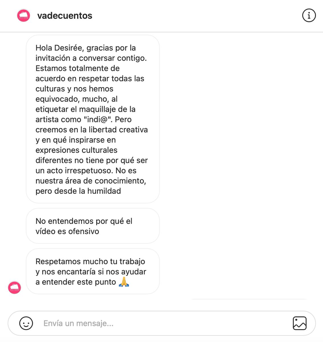 De esto ya he hablado antes. Una cultura que ha sido históricamente violentada, y lo sigue siendo, no es motivo de disfraces. Y punto. De nuevo, me ofrecí para hablar con vadecuentos y, ¡oh, sorpresa!, me escribieron por privado: