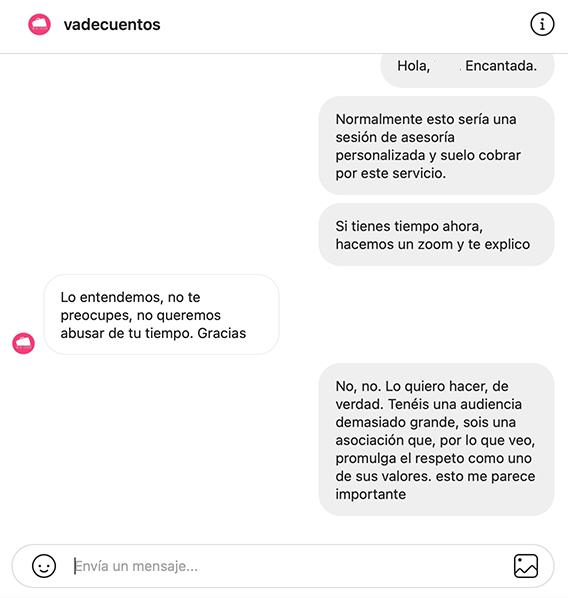 Me ofrecí para hablar por privado porque me parece importante que las cuentas con tanta audiencia —tienen una comunidad de más de sesenta y ocho mil (68.000) personas— se revisen. Una cuenta así, que además tiene un proyecto relacionado con la educación y con los valores, llega a un público muy amplio y, por lo tanto tienen una responsabilidad que no deberían eludir.