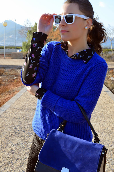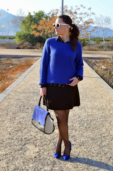 No voy a hacer ninguna entrada especial porque sinceramente no tengo tiempo, así que os muestro el look que llevé ayer para ir a la oficina. En este outfit llevo varias prendas que adquirí en rebajas, entre ellas la falda y la camisa de estampado maquillaje. Como todavía sigue haciendo frío opté por llevar un jersey de lana grueso en azul Klein para continuar con el juego de colores. Ah! Y no me olvido del bolso tipo Céline que os mostré hace algún tiempo, estoy enamorada de él, no puede ser más bonito. ¿Cómo os gusta más el bolso con o sin orejitas?