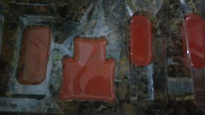 Ahora solo hay que poner unas gotitas del colorante elegido, yo uso colorante alimentario porque creo que es mejor, si podemos comerlo digo yo que no es malo para la piel. Cuando hemos echado las gotitas del colorante removemos muy muy bien para alcanzarel tono deseado y ponemos la mezcla en los moldes. Además de los típicos moldes de silicona yo usé unos envases vacíos de colonia, es una forma de reciclar y encontrar formas divertidas para nuestra crema sólida. Eso sí, los "pinté" con un poco de aceite para que la mezcla no se pegase.