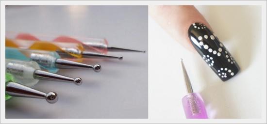 Los puntos se ven adorables cuando se hacen bien en un color de contraste sobre una capa base de pintura de uñas. Es también la más fácil y rápida. Sólo asegúrese de tener una colección de herramientas para crear puntos en diferentes tamaños. También puedes usar estas herramientas como pinceles muy pequeños para crear diminutos efectos de pintura en la uña.