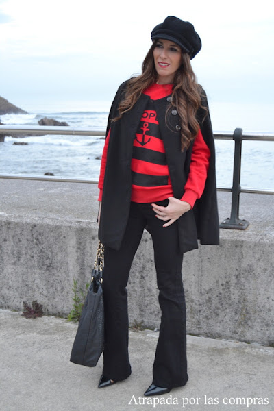 El look de hoy tiene un marcado estilo sesentero con cierto toque british y es que no hay que olvidar que en los años 60 en Londres se produjo una revolución en cuanto a tendencias unida a un cambio en la forma de vida gracias a la música y las ganas de liberación después de unos años de represión que marcó un antes y un después convirtiéndose así en una de las capitales de la moda, es lo que se llamó el Swinging London con la diseñadora Mary Quant como referente y lo que supuso la aparición en la escena londinense de los mods y de los hippies (prometo dedicar un post a esta revolución de la moda ya que merece la pena) En este look mezclo un poco de esa estética hippie con el pantalón de campana y de la estética mod con la sudadera de rayas, la capa y la gorra. Qué os parece el look?
