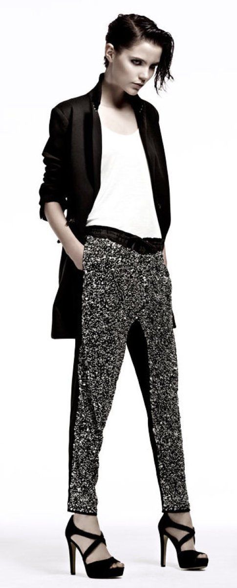 Si buscamos un estilismo de plena tendencia, podemos tomar como referencia las propuestas de Pull&Bear, ya sea mediante un resultado masculino a base de pantalón baggy con fajín o repleto de pedrería. En este sentido, Mango nos propone un mono para lograr un aire diferente, así como un traje de terciopelo o un total look en blanco.