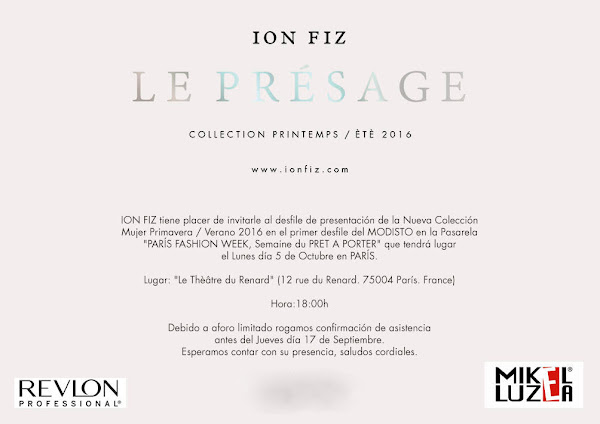 El pasado lunes 5 el diseñador ION FIZ presentó durante la Semana de la Moda de París, cuna de la moda, su colección primavera/verano 2016 LE PRÉSAGE en el Le Théâtre du Renard, un acontecimiento digno de mención, no sólo porque un diseñador español presente su colección en París, sino porque también era el debut de ION FIZ en la capital de la moda, un acontecimiento al que tuve el honor de estar invitada y que como desgraciadamente no pude asistir no me perdí detalle. El desfile contó con la colaboración del peluquero MIKEL LUZEA quien con sus peinados muy años 80 completó una colección en la que se da especial protagonismo a la ropa interior, con encajes, superposiciones, detalles de plumas y sobre todo muchas transparencias. En la pasarela ION FIZ contó con la presencia de la estilista y periodista Clara Courel que no quiso perderse la oportunidad de desfilar para este gran diseñador.
