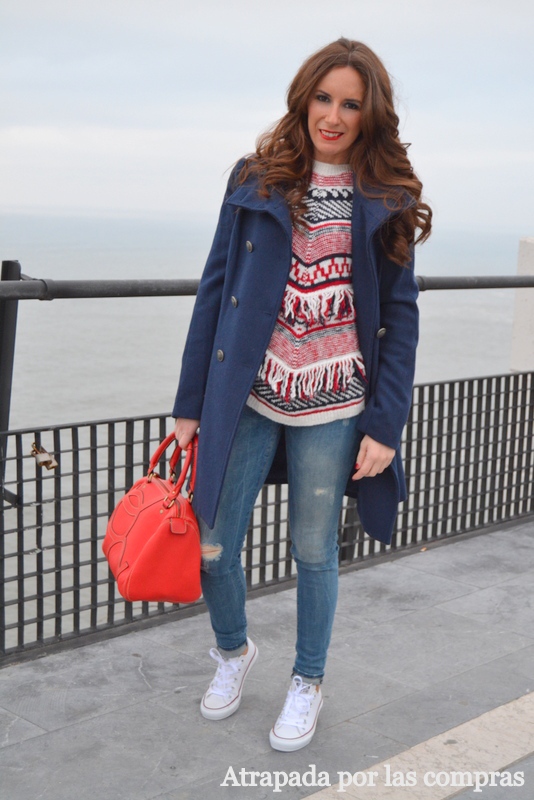 Este jersey de flecos de Pull&Bear que os enseño en el look de hoy me enamoró desde la primera vez que lo vi ya que en él se fusionan por un lado los flecos, que son tendencia esta temporada pudiendo encontrarlos no sólo en complementos sino también en prendas de vestir, por otro el estampado étnico y para terminar combina dos de los colores más in en este otoño/invierno 2014/2015, el rojo y el azul. Lo combiné con unos jeans rotos, un abrigo azul marino con cierto aire marinero que me pareció bastante acorde con el jersey por las olas que parece tener dibujadas en la parte superior y de calzado mis nuevas All Star de Converse. En cuanto a los complementos, un bolso rojo de Purificación García y una pulsera con un estribo, una de las piezas de la nueva colección de Un Poquito de Mi, os hablé hace muy poquito de ella (aquí). Qué os parece el look?