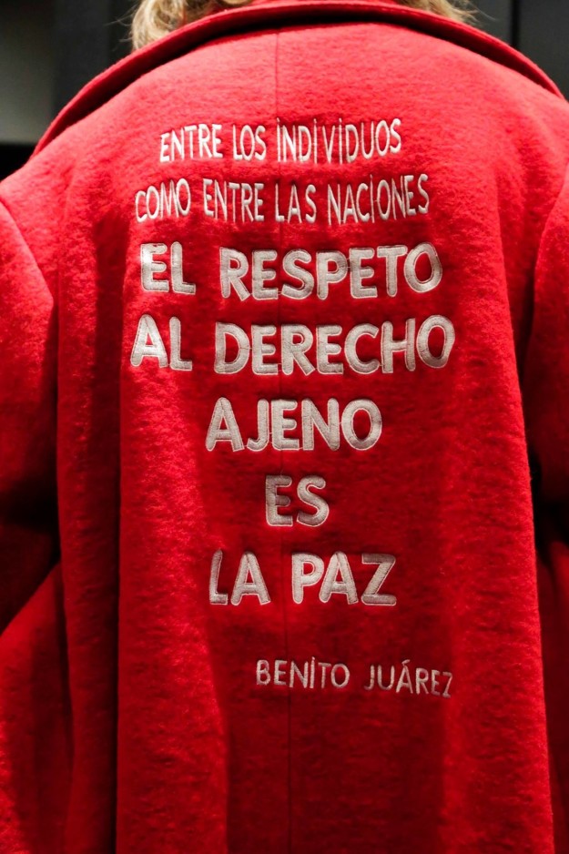 La famosa frase de Benito Juárez también forma parte de los bordados que resaltan en la colección del torreonense. // Foto de LaFemmeFataleMx