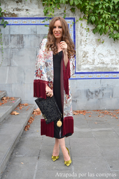 Una de las tendencias de este otoño/invierno son los flecos, veremos flecos por todos los lados, vestidos, chaquetas, pendientes.... Y siguiendo esta tendencia hoy os enseño el look con el que acudí el pasado viernes 29 a la entrega de los XI Premios ADYMO con un kimono de flecos y estampado floral de Zara que fue un flechazo en cuanto lo vi, me pareció espectacular sobre todo por el colorido que tiene, es la típica prenda que llama la atención y que hace resaltar un look de lo más básico. Lo combiné con un mono culote negro dejando todo el protagonismo al kimono, zapatos de color mostaza al igual que algunas de las flores del kimono y como complemento estrella una cartera de mano de terciopelo negro brocado y personalizada con mis iniciales, una cartera super especial hecha por mi amiga Lourdes de SOÑANDO CON EL MAR. Qué os parece el look?