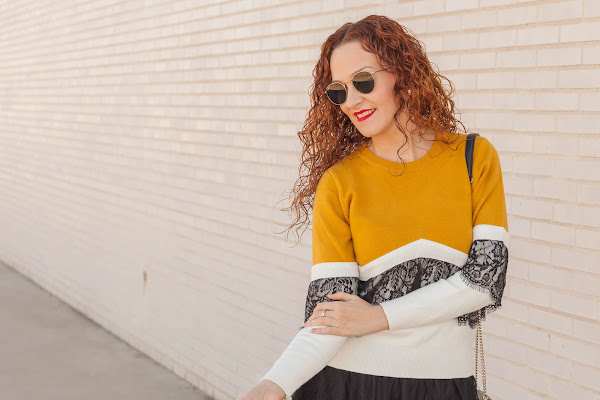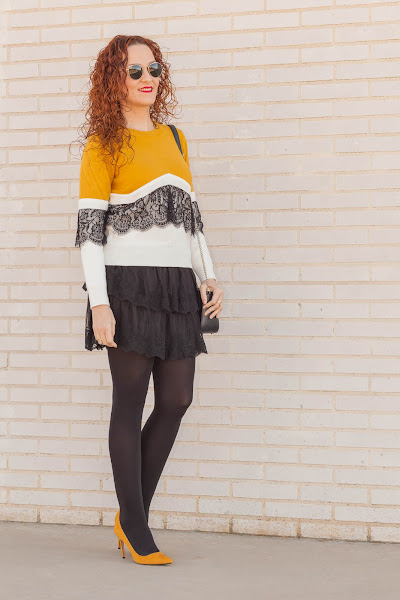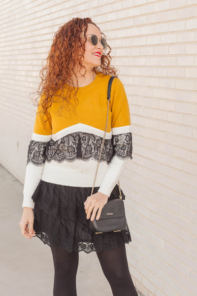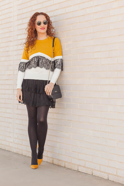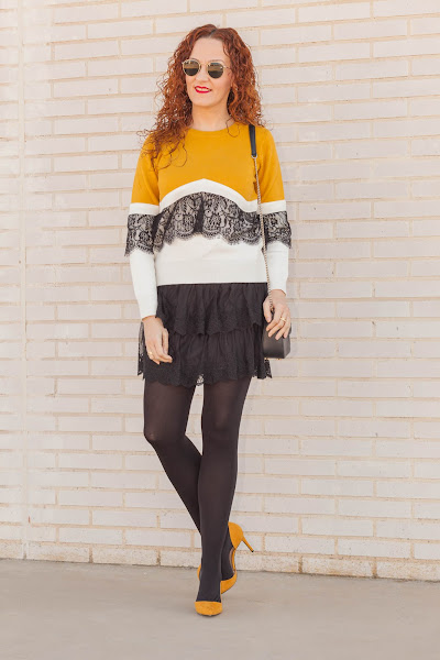 Es ver una prenda con encaje y para allí que se me van los ojos. Además, en el caso de este jersey todavía más ya que combina mis colores favoritos, por lo que fue verlo y enamorarme de él. El domingo lo estrené combinándolo con una falda también de encaje y zapatos mostaza, que hacía bastante que no me ponía y que me encanta como quedan con este look.