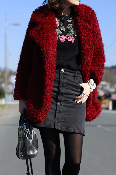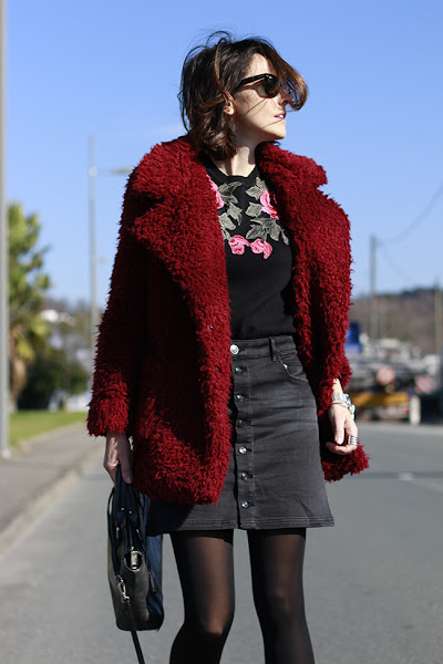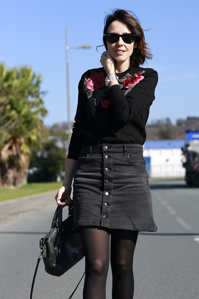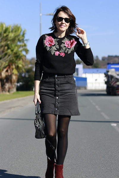 Un jersey especial, lleno de flores que alegra cualquier día un poco tristón, una falda cómoda y trotera para llevar en cualquier ocasión, un abrigo calentito y de tendencia en un color que me llena de luz y unos botines con la altura justa de tacón y de caña, perfectos para llevar con pantalón o falda ¿Algo más?
