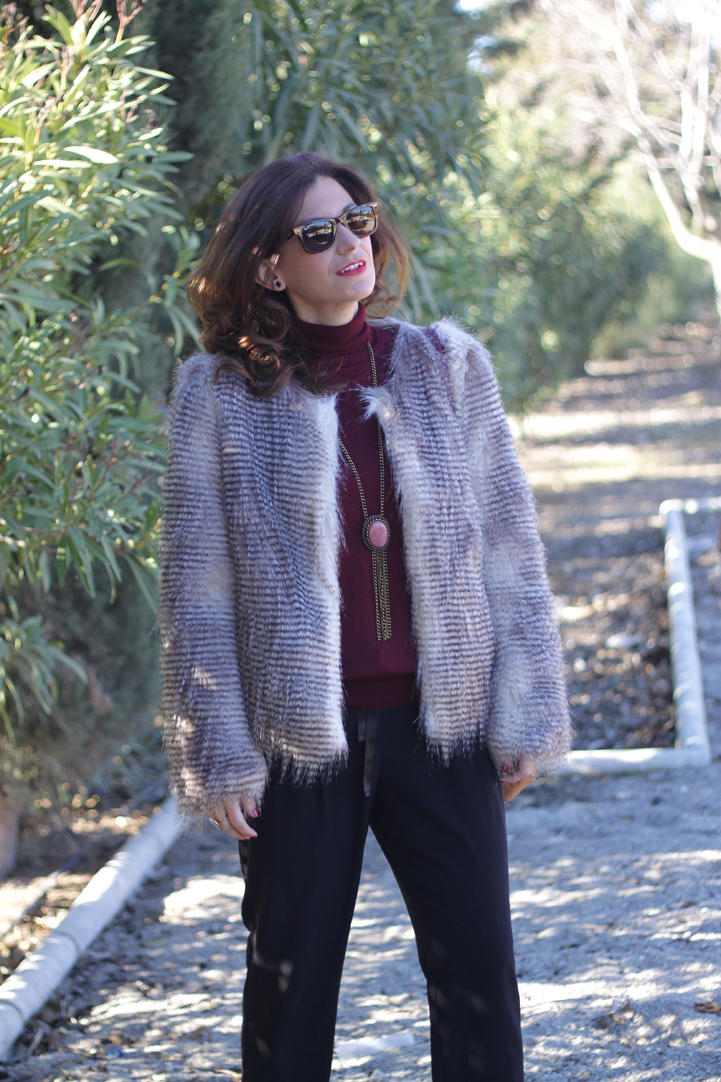 ¡Ya estamos a mitad de semana! Hoy os traigo un look con uno de mis abrigos de pelo favorito, creo que en la foto no se aprecia lo bonito que es ^_^. Como el abrigo es llamativo, decidí apostar por básicos y me puse jersey de cuello alto en color burdeos y pantalones de vestir negros. ¿no dicen que menos es más? Otra vez llevo el bolso de Purificación García (¡no sabéis el juego que da un bolso en esos tonos, me lo habéis visto en multitud de looks como aquí, aquí o aquí!), y zapatos negros de tacón. ¡Muchas gracias por todos vuestros comentarios!