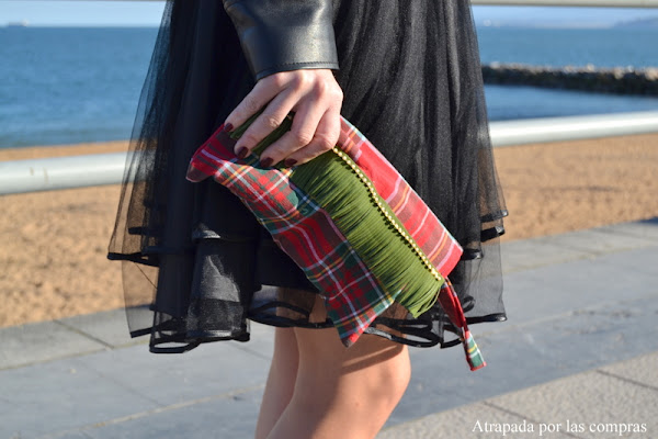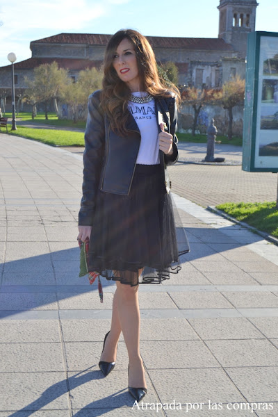 Seguimos con más ideas de looks de noche, hoy con un look con cierto estilo rockero perfecto para una cena de amigas. Siempre me han gustado las faldas de tul creo que son muy estilosas y que pueden dar mucho juego, en este caso combino una falda de tul negra con una camiseta de la colección cápsula de BALMAIN para H&M y una perfecto de cuero. El toque de color lo aporto con un clutch tartán hecho a mano de HILANDO CABOS. Qué os parece el look?