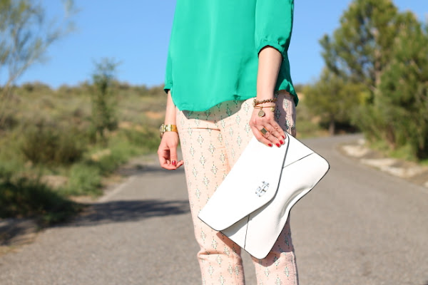 Como habréis podido comprobar el verde es un color que tan apenas utilizo a la hora de vestir, la verdad es que se me resiste bastante porque muy pocas veces veo prendas en este tono que me llamen la atención. Sin embargo el último día que fui de shopping me topé con estos pantalones capri en tonos rosas con dibujos verdes y me enamoraron, enseguida me imaginé diferentes looks con ellos. Hoy os muestro uno de ellos con blusa satinada y zapatos verdes, para los complementos me he decantado por el blanco en el clutch y en el collar de flores.
