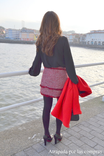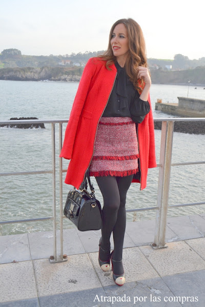 La clásica combinación de negro y rojo nunca falla, es elegante, es atemporal y sin duda llama la atención. Hoy os enseño un look lady en clave negro y rojo en el que combino una falda de tweed con flecos de Mango de la temporada pasada, jaspeada en tonos negro, rojo y blanco con una camisa negra con lazada de Stradivarius. Las camisas con lazada son un must have de este otoño/invierno, rescatadas de los años 70 son perfectas para crear looks lady como el que os enseño hoy, pero también looks románticos, looks masculinos e incluso looks retro, lo que nos demuestra la versatilidad de esta prenda. Como prenda de abrigo le añadí un abrigo rojo que da más luminosidad al look y de calzado unos zapatos de Moschino que parecen estar hechos para este look. Qué os parece el resultado?