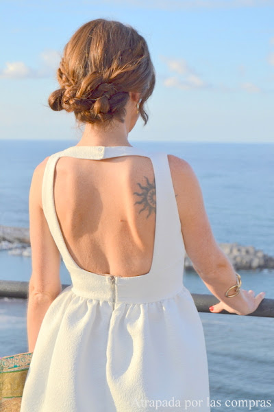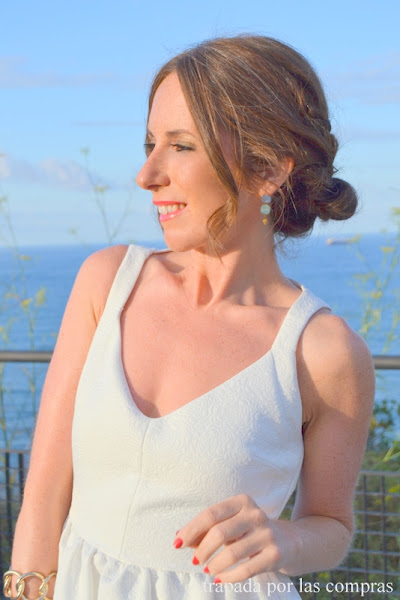 El blanco es el color del verano por excelencia, así que casi se que puede decir que un vestido blanco es prácticamente imprescindible en nuestro fondo de armario veraniego. En el post de hoy os enseño un look romántico con un vestido blanco que tengo desde hace tiempo y que es sin duda uno de mis favoritos, ya no sólo por el color, sino por el corte que tiene, el escote de la espalda...., es uno de esos vestidos que te lo pones y te sientes especial. Para este look lo he combinado con unas cuñas de esparto, pero encajaría perfectamente con una sandalia plana, un bolso étnico que aporta todo el colorido necesario al look y de complementos un brazalete y unos preciosos pendientes de cristales de swarovski y hechos a mano de de LOS SUEÑOS DE MI NIÑA. El toque más romántico lo aporta el peinado, las trenzas están arrasando este verano, así que para este look mi peluquera Verónica de SALÓN DE PELUQUERÍA PERRINO de Candás optó por hacerme un recogido con dos trenzas, un peinado perfecto para lucir con este vestido y además muy cómodo e ideal para los días de calor. Qué os parece el look?