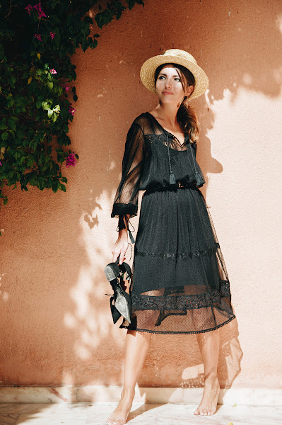 «Forrado con un vestido de modal cosido, este vestido en maya punteada es detallado con paneles bordados y borlas de un ambiente bohemio urbano.»