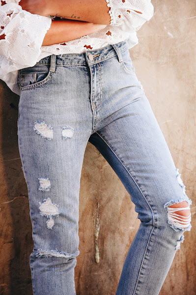 «Hechos en denim lavado y con detalles destruidos, estos jeans dan un look vintage a cualquier outfit. Junto con una camiseta para un look de dia a dia o con una blusa de encaje para un look más femenino.»