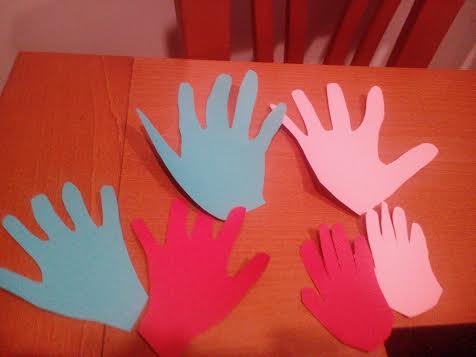 En primer lugar se cogen las cartulinas y se van dibujando las manos. Yo hice una mano de cada calor. Y participamos mis dos niños y yo.
