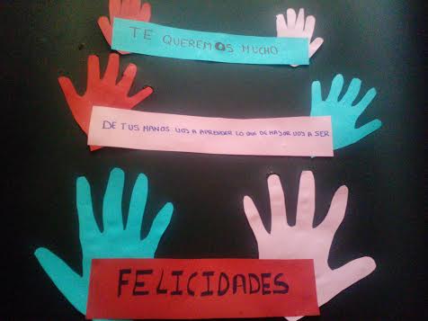 Después se cortan unas tiras de cartulinas del color que queramos y se le escriben unos mensajes personalizados con rotuladores: Felicidades, te quieremos…, el mensaje que se nos ocurra y que le guste.Y se pegan las tiras en las manos.