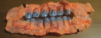 Para hacernos una dentadura, tenemos que comenzar haciendo tiras un trozo de papel higiénico y puntar con un pincel la zona del bigote. Antes de que se seque el látex, ponemos una tira de papel sobre él y presionamos para que se quede pegado. Aplicamos más látex y sin esperar a que se seque, vamos pegando las uñas postizas de manera que las uñas más grandes sean las paletas y las más pequeñas la de los dientes de los extremos. Cuando hayamos colocado todos los "dientes", los fijamos con más látex por encima y entre ellos y aplicamos otra tira de papel. Cuando se seque la capa, aplicamos otra y ya pasamos al maquillaje del resto de la cara. Simplemente tenemos que hacer un boceto en nuestro rostro los los trazos de nuestro maquillaje, en mi caso marcar la forma de los ojos y los detalles. Pintamos con pinturas especiales o en su defecto con maquillaje y sombras la cara y... ya habremos terminado! =)