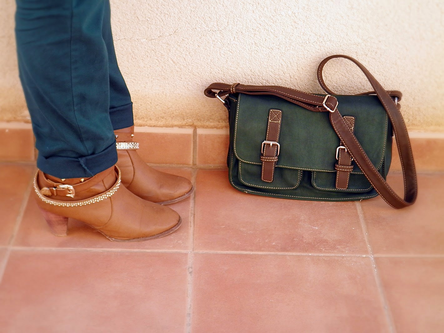 Este look que os enseño en un día tan soleado y yo tan abrigada, parece un poco raro no? Este fin de semana ha hecho unos días esplendidos, soleados, pero eso sí, cuando hace un poco de viento éste es muy fresco. Opté por un outfit cómodo y calentito. Unos pantalones de tacto melocotón en verde y una camiseta básica marrón. Para combatir el frío la maxi bufanda, y para combatir el sol el sombrero.