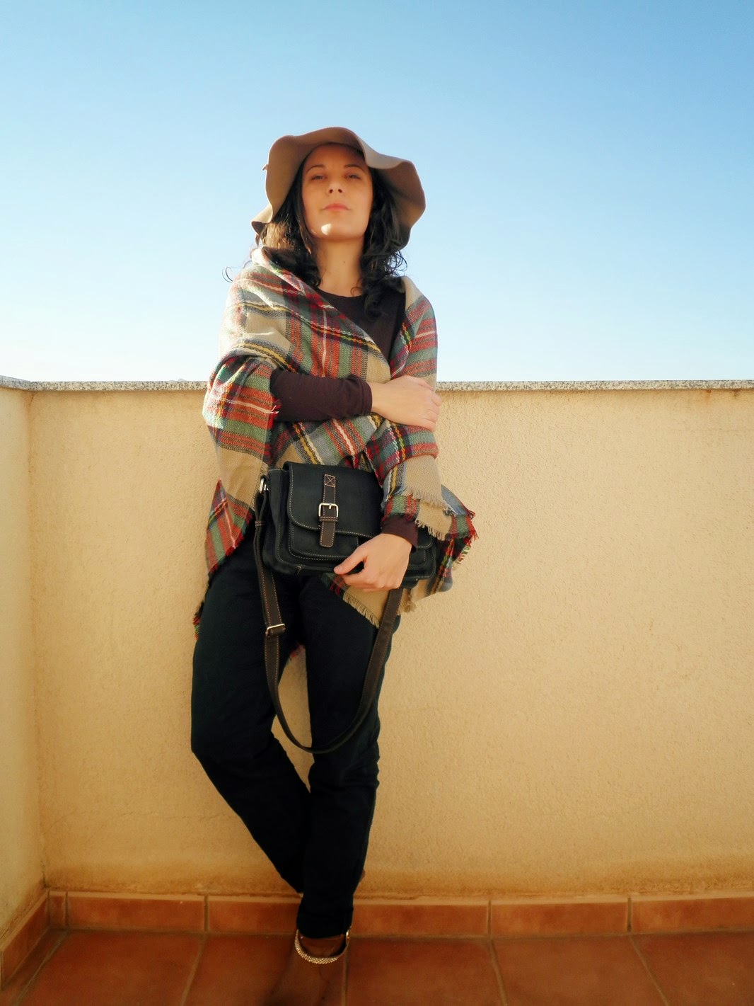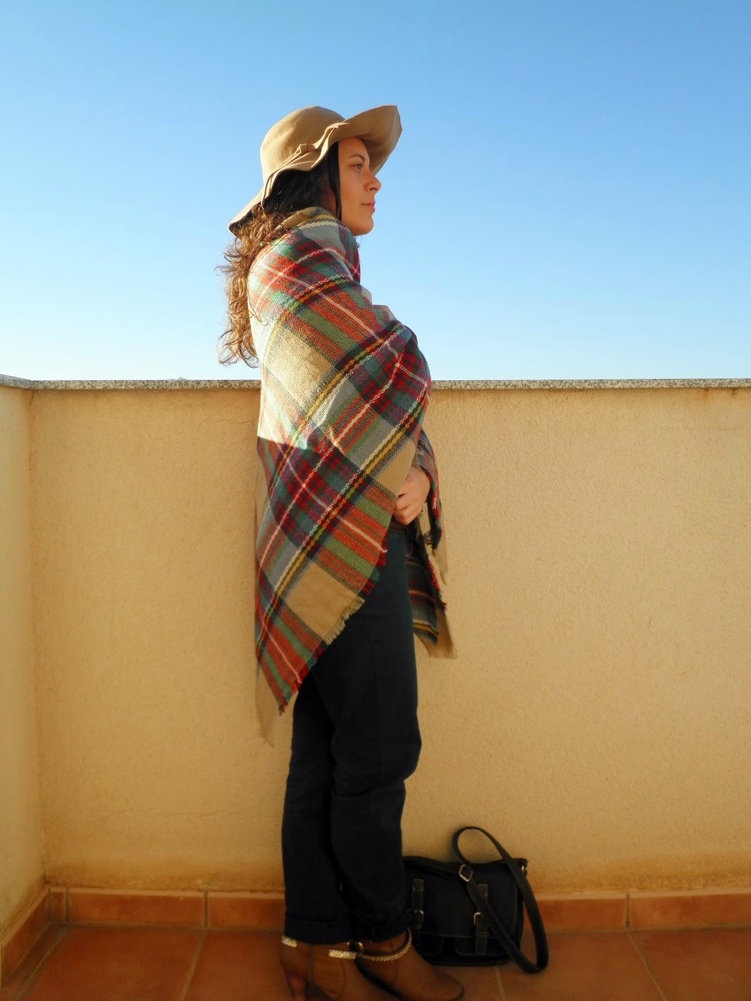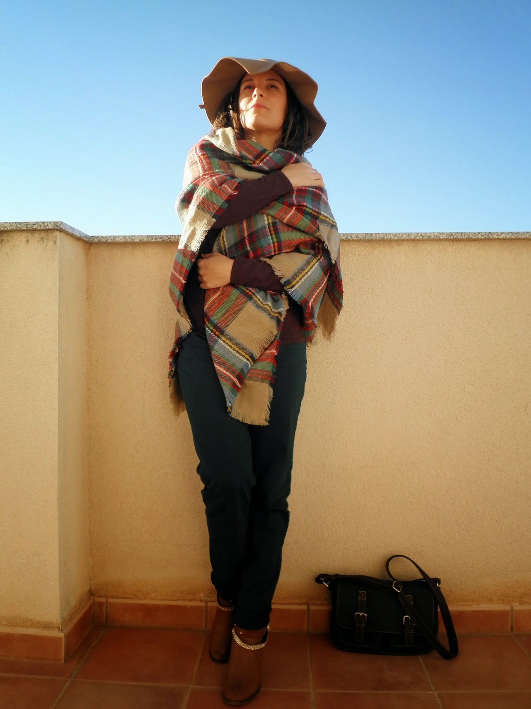 Maxi bufanda: Sheinside / Pantalón: Mulaya / Camiseta: Stradivarius / Botines: Tienda local / Sombrero: Ebay / Bolso: ?