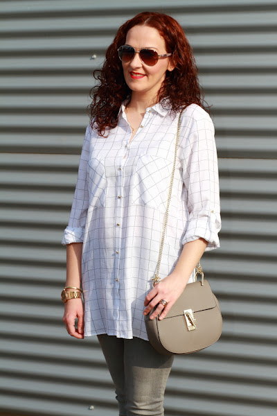 Hoy os enseño un look de hace un par de meses que sin querer se había quedado en una carpeta olvidado y del que ya ni me acordaba.Es un look sencillo con una camisa larga de cuadros tan de tendencia esta temporada y jeans grises, lo acompañé de un bolso inspiración del Drew de Chloé y botines también en gris.