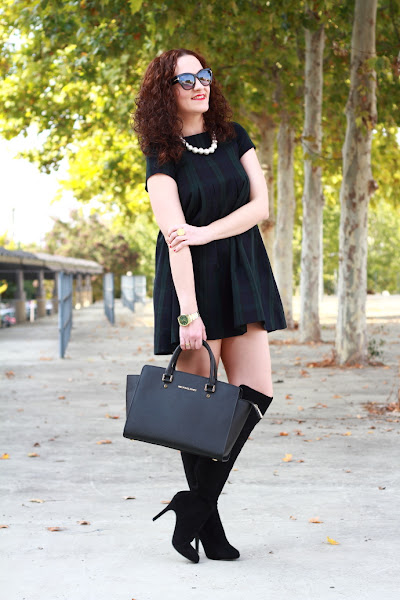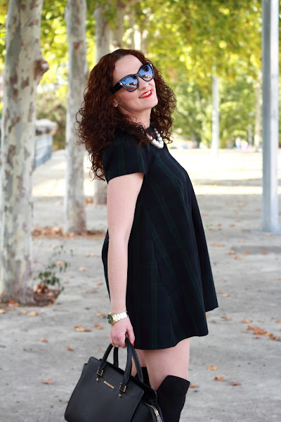 Hace unos días, en mis redes, os adelanté un poquito de este look al que le tengo un cariño especial y que por vuestras respuestas os encantó. Tanto el vestido como el collar los compré el año pasado durante mis vacaciones en Japón, concretamente en una preciosa boutique que encontramos en Tokio. En la mayoría de las ciudades grandes encontrar ropa y complementos de todos los estilos es fácil. En mi caso, como ya os he contado alguna vez, siempre acabo descubriendo tiendas en las que termino llevándome cositas preciosas. Pero de verdad que en Tokio estuve en tiendas en las que tenía que hacer un verdadero esfuerzo por no llevármelo todo y esta fue una de ellas. Así ya sabéis el el motivo por el que a este look con vestido de cuadro escoces, collar de perlas y botas over the knee le tengo un especial cariño.