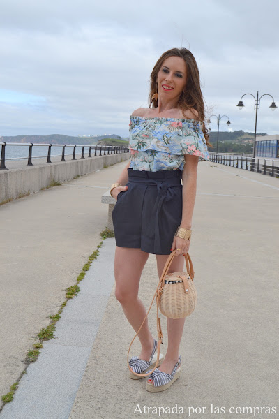 El mix and match, la mezcla de estampados, una tendencia atrevida pero que puede convertir un look simple en un look llamativo y diferente. En el look de hoy mezclo dos estampados muy de tendencia esta temporada, por un lado un top con escote off the shoulders y estampado tropical y por otro unas sandalias de esparto de rayas de marineras. Como prenda comodín un short azul marino de cintura alta con pinzas y cinturón, una tendencia en pantalones que nos lleva acompañando desde primavera tanto en largo como en corto. De bolso de nuevo la cesta de mimbre que ya me habéis visto un montón de veces. Qué os parece el look?