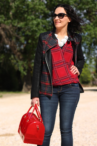 Normalmente no suelo arriesgar mucho a la hora de mezclar estampados, pero ayer, cuando estaba decidiendo que chaqueta ponerme enseguida me vino a la cabeza esta biker. Para sorpresa mía el resultado de la combinación del estampado tartán de la blusa con el de la chaqueta me encantó. Creo que a partir de ahora me voy a ir animando más a utilizar estos combos.