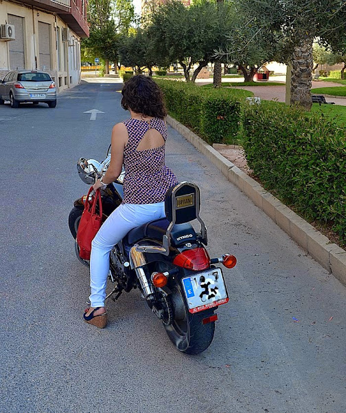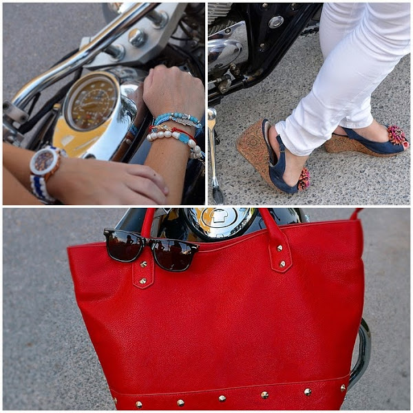 ¿Bonita la moto eh? Es una pasada, es preciosa y tiene un brillo especial cuando le da el sol. Vamos a por el look...es un outfit muy básico. Unos pantalones blancos y una blusa estilo peplum. La blusa la tengo de hace por lo menos un par de años, la compré en Primark y me encantó por el detalle de la espalda. Además tiene un estampado de florecilllas pequeñas (no se aprecia en las fotos) rollo años 60 que me encanta. Como complementos elegí mi maravilloso bolso rojo y unas cuñas que me compré el verano pasado de Mulaya (fue una emergencia, los zapatos que llevaba me estaban matando).