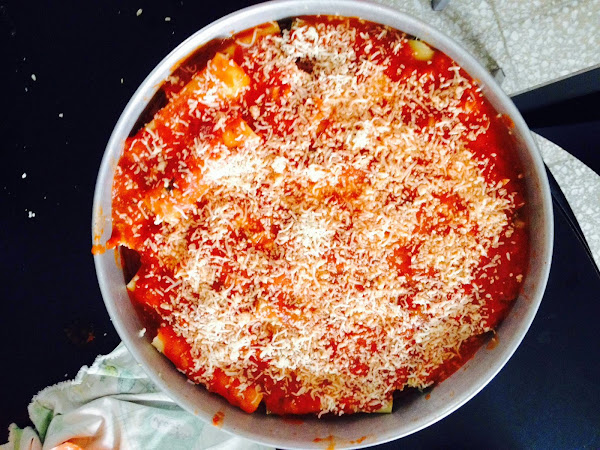 Cocer los canelones según las instrucciones de la caja donde bienen y proceder a rellenarlos con una cuchara pequeña, metemos como podamos la pasta preparada en los canelones y haci rellenamos todos, los canelones sobrantes los podemos rellenar con queso fresco pues salen deliciosos, después en un pirex, echamos un poco de salsa que hicimos anteriormente y sobre la salsa colocamos todos los canelones, agregamos las salsa sobrante encima y agregamos la taza sobrante de queso mozarella, tapamos con papel aluminio y procedemos a precalentar el horno a 220ºC y horneamos durante 30 minutos.