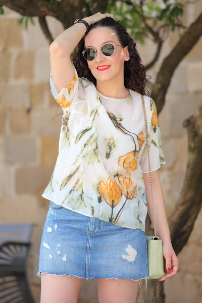 El lunes os conté que el fin de semana del cumple de mi chico lo reservamos para nosotros y que una de las cosas que hicimos fue hacer un poco de turismo por nuestra zona. Cuando queremos conocer lugares con historia casi siempre nos vamos lejos, sin embargo a nuestro alrededor tenemos sitios bonitos sin descubrir. Ese finde nosotros decidimos que nos apetecía conocer más a fondo una de las poblaciones cercanas y para allí que nos fuimos. Hacía mucho, pero mucho calor así que estrené una blusa de flores que compré durante mis pasadas vacaciones en Oporto. La combiné con una mini falda tejana, palas camel y un bolso que compré hace bastante tiempo pero que todavía no había estrenado.
