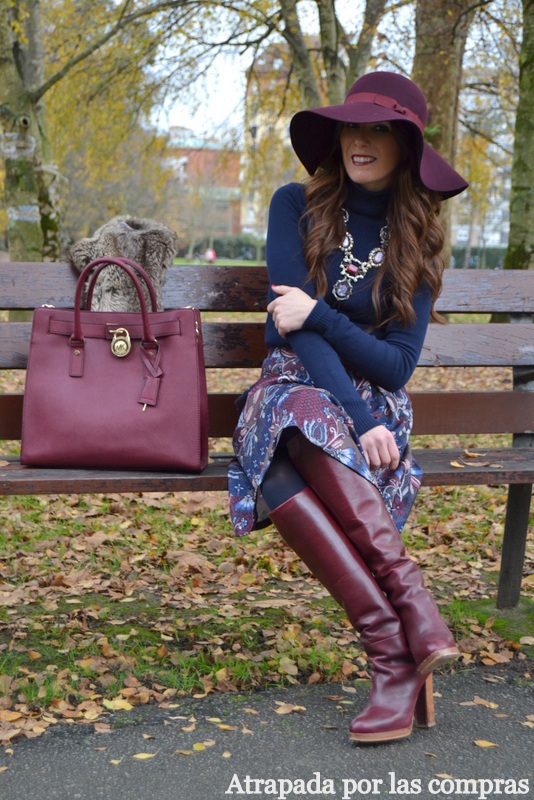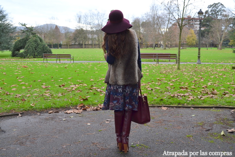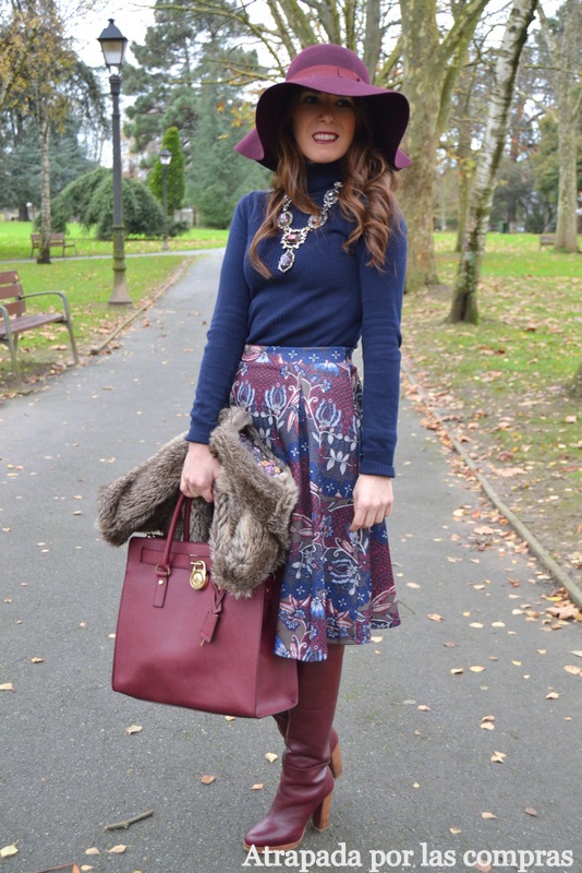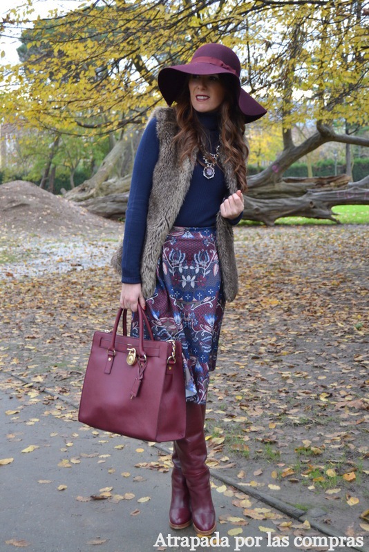 Todo lo que saco habitualmente en el blog encaja perfectamente con mi estilo pero el look de hoy es uno de mis favoritos porque en él mezclo dos tendencias que personalmente me encantan, por un lado la falda midi que combino con unas botas altas, otra forma de llevar esta falda tan de tendencia esta temporada, y por otro el estilo boho que consigo gracias a la pamela de fieltro y al chaleco de pelo. En cuanto a la combinación de colores, azul marino y granate, son dos colores que encajan perfectamente, y de prenda de abrigo un chaleco de pelo en un tono neutro que rompe un poco el conjunto. Qué os parece el look?