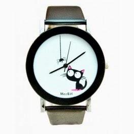 Este es el reloj, como podéis ver es muy bonito y tiene una imagen muy divertida de un gatito con una araña. Estaba en varios colores pero yo me quedé con el negro. Tiene un buen tamaño, ni demasiado grande ni demasiado pequeño y queda muy cuco una vez puesto. Me tiene loquita. Je je! Ahora están de rebajas en la web y me parece que está a menos de 13 euros. (Si lo sé me espero a pillarlo). En fin, una que se deja llevar por el momento y no piensa antes de comprar.
